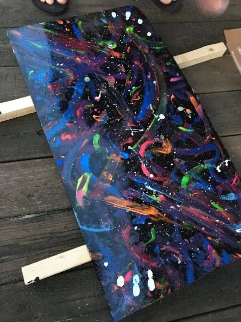Then came the super fun part! We splatter painted the surface. Oh, man! It was so fun. We used some sponges and random acrylic paint that I already had from past projects. We started with some metallic blue, matte purple and plum and swirled it around. We did some finger painting and used toothbrushes (from Turkish Airlines) to create some light splatter. We swirled on some neons and splattered some white and glow in the dark paint. Then we let it dry.... and I went back in and did some more because I can't stop myself sometimes. I just felt like it needed some more in spots. And, let's be honest. I was just having too much fun.