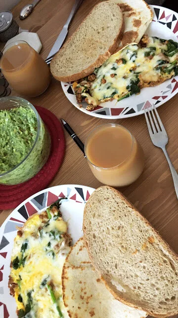 Eating our red pepper omelette, feta cheese and fresh salsa outside