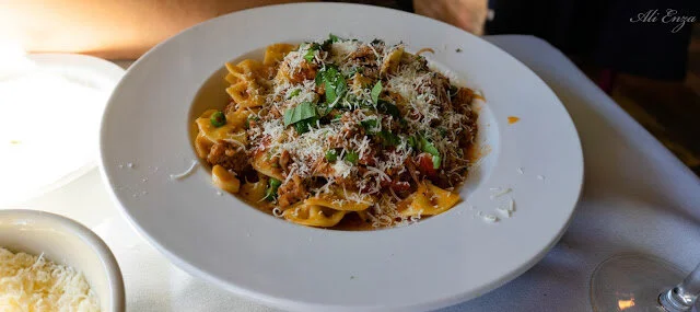 After the appetizers we both had lovely pasta dishes to share. We opted for the hand stretched farfalle and the hand stretched papardelle. I'm sad that I missed taking pictures of them making them. In the front window, when we arrived, they were making pasta, but I decided to wait until after eating (we were starving). But by the time we left, they were done for the afternoon so I missed a picture opportunity.